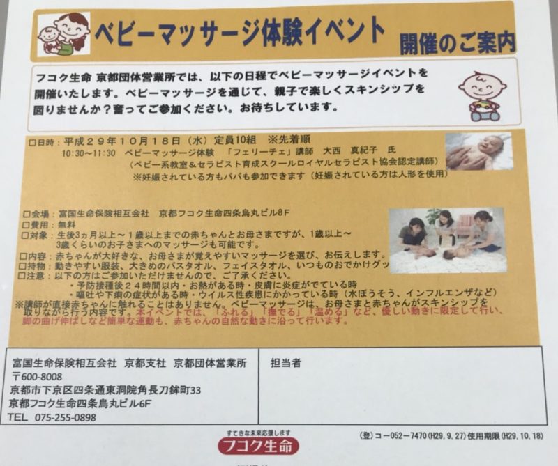 烏丸四条・京都大丸すぐ近くのフコク生命さんでのベビーマッサージ体験イベント開催が決定しました!